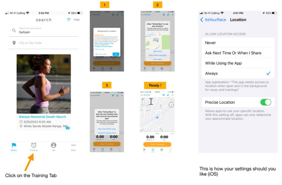 We want to make sure you have a seamless experience with your virtual race! We HIGHLY recommend taking the app out and doing at least a 0.25 training walk or run before tracking your actual virtual race. Why? You will want to make sure all permissions for location services are turned ON and set to ALWAYS ALLOW.
