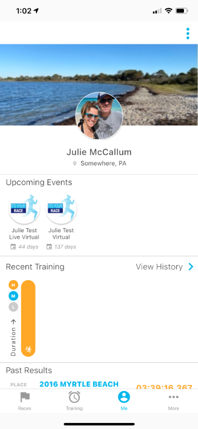 Tap the "ME" icon and verify that your virtual race is showing up under MY UPCOMING EVENTS.